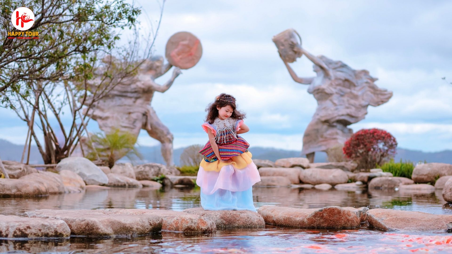 • Tượng "Vũ điệu Langbiangland" trên hồ vô cực tái hiện hình ảnh chàng trai K’ho gõ chiêng và cô gái K’ho nâng gùi lúa vàng trong điệu múa truyền thống