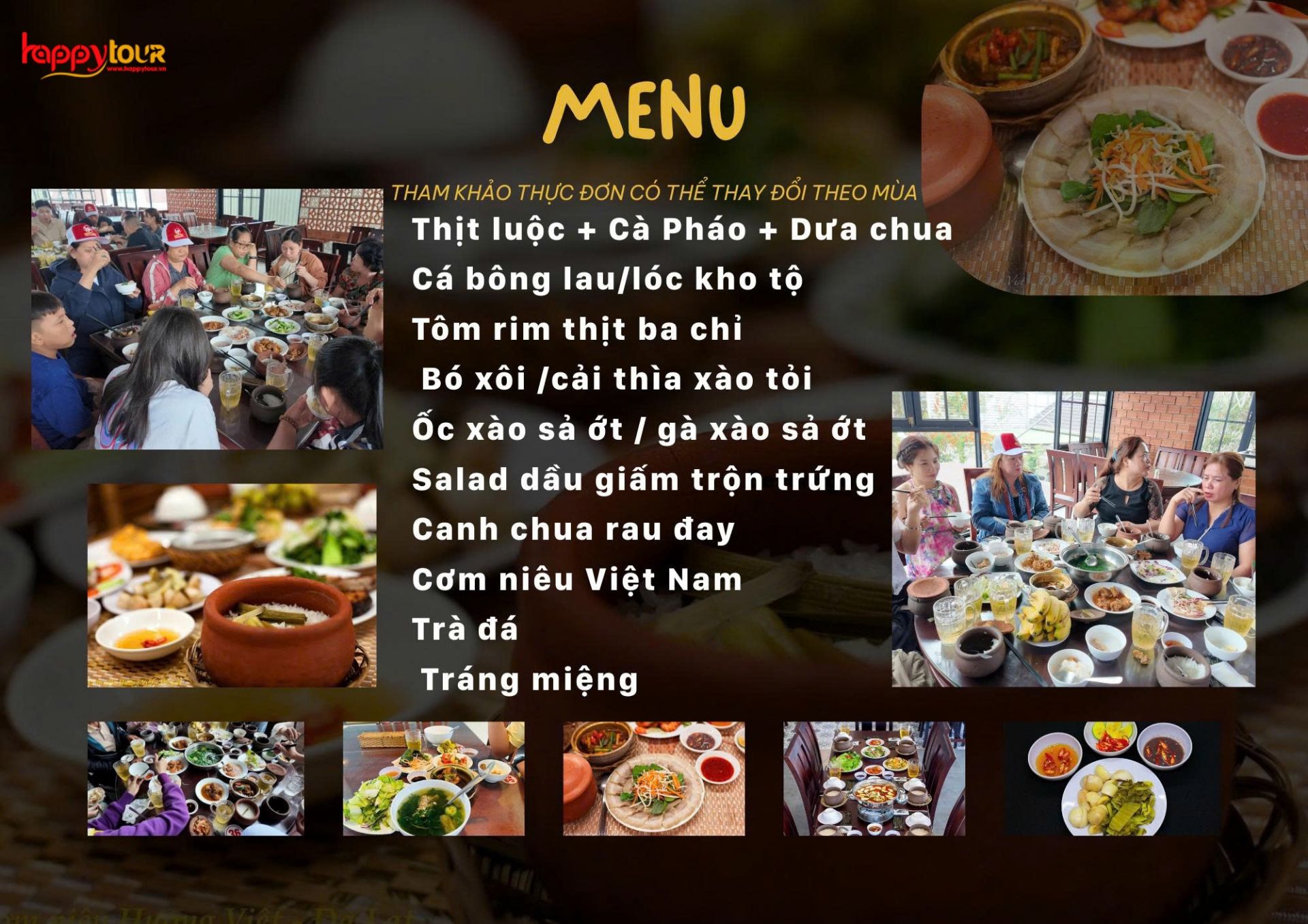 + 04 bữa ăn chính: Thực đơn phong phú thay đổi liên tục. Trong đó có 1 bữa cơm niêu & 01 bưa buffet lẩu rau không giới hạn