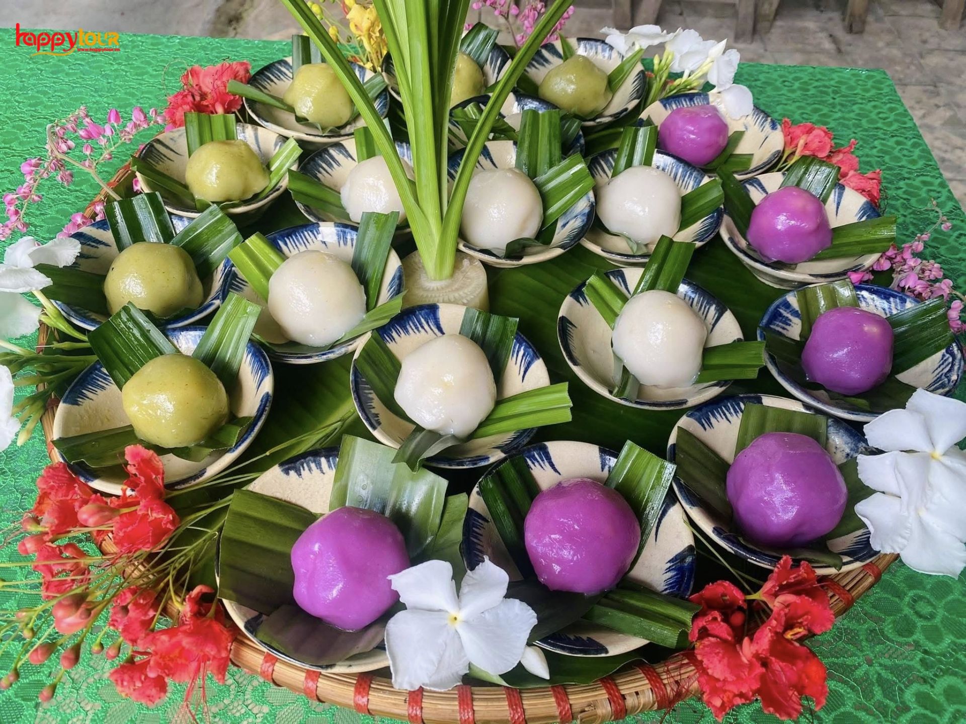 Thưởng thức: mâm mứt hạnh phúc và bánh lọt, sâm sâm hoặc chuối xào; bánh lá, nước dừa tươi, bánh ít trần; mâm cơm gia đình